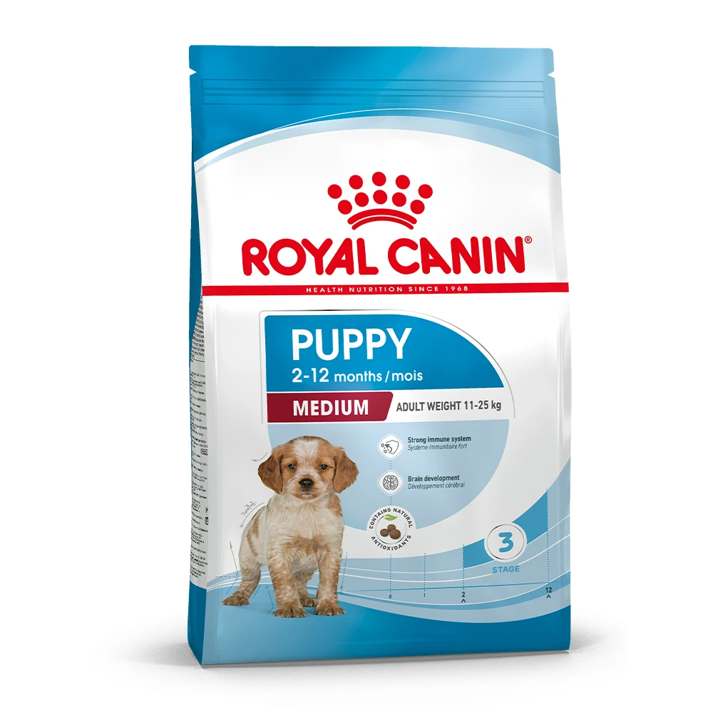 ROYAL CANIN® Medium Puppy Startpakket voor jouw puppy bevat naast een verpakking Medium Puppy 4 kg ook een gratis brochure met giftcard t.w.v. €10 en Mijn Eerste Jaar-boek. Met de giftcard krijg je direct €10 korting op je volgende aankoop op onze website. Het Mijn Eerste Jaar-boek zit boordevol interessante informatie, tips en invulvragen over het eerste jaar van je puppy en heeft ook ruimte voor je favoriete foto’s. Bestel nu dit unieke Startpakket voor dezelfde prijs als ROYAL CANIN® Medium Puppy 4 kg voeding.Â