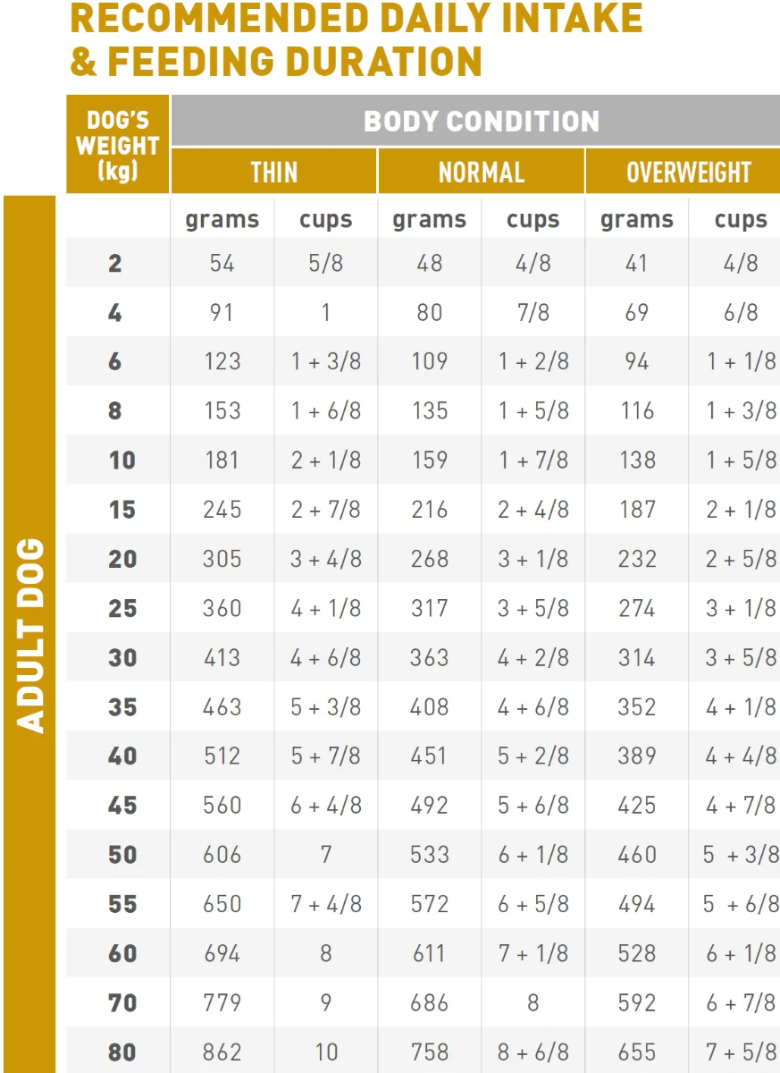 Zie voedingstabel. Geef de voeding droog en zorg dat er altijd vers drinkwater beschikbaar is. Productiecode, registratienummer en datum van minimum houdbaarheid: zie verpakking. Bewaren in een droge en koele omgeving. *L.I.P. : eiwitten geselecteerd vanwege hun zeer hoge verteerbaarheid.